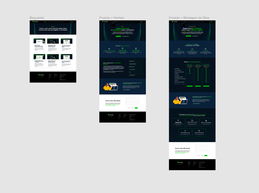 Cada página foi desenvolvida individualmente, juntamente com seus respectivos assets, utilizando o Figma como ferramenta central do processo. Nesse ambiente, foram criados wireframes de alta fidelidade, permitindo validações, ajustes e aprovações antes da implementação final, garantindo consistência visual e funcional em todo o website.